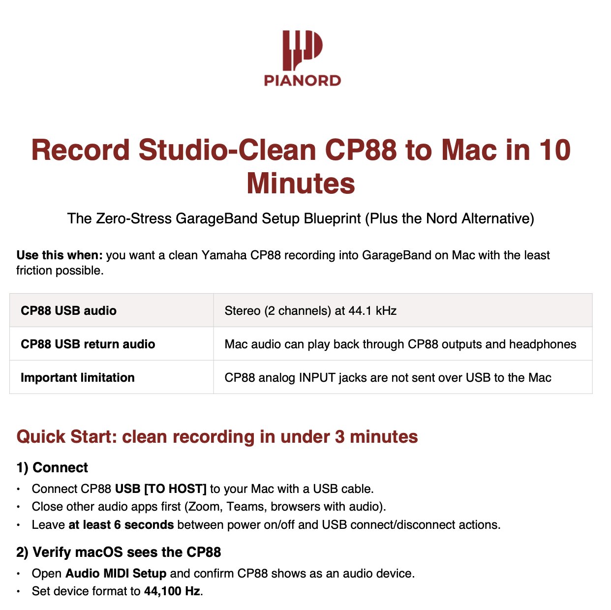 • The fastest clean setup for CP88 (USB audio + MIDI)